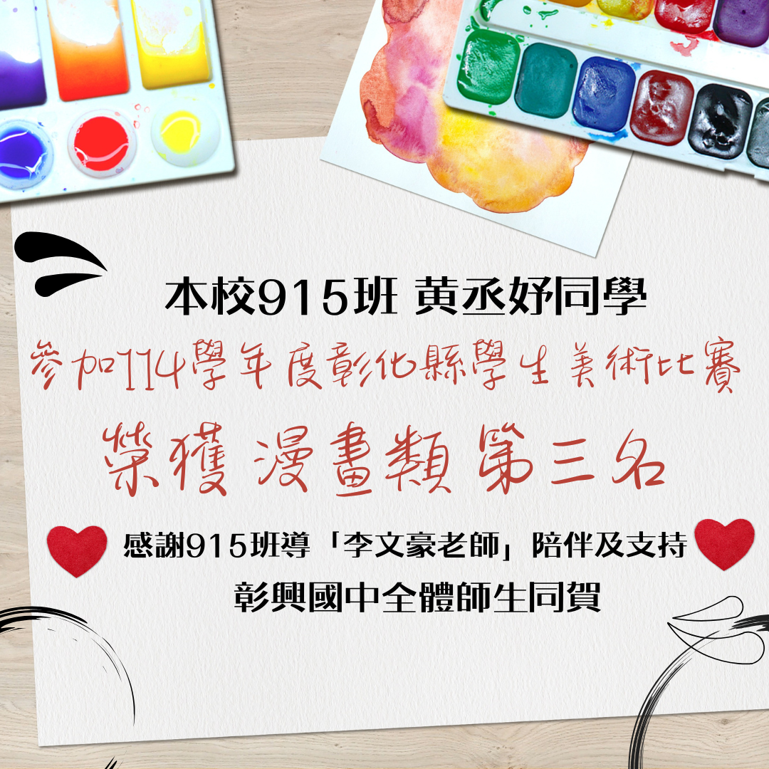 賀!915班 黃丞妤同學 參加114學年度彰化縣學生美術比賽 榮獲 漫畫類 第三名