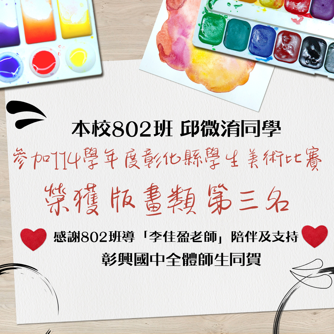 賀!802班 邱微淯同學 參加114學年度彰化縣學生美術比賽 榮獲 版畫類 第三名