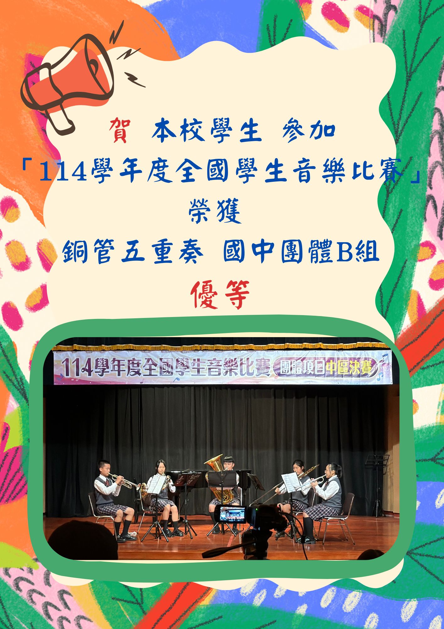 🎉 恭喜 本校學生 702 洪O謙、715 鄭O君、804 王O庭、804 洪O妤、811 湯O軒 參加 114 學年度全國學生音樂比賽---銅管五重奏 國中團體B組 榮獲 「優等」!🏆🎺...