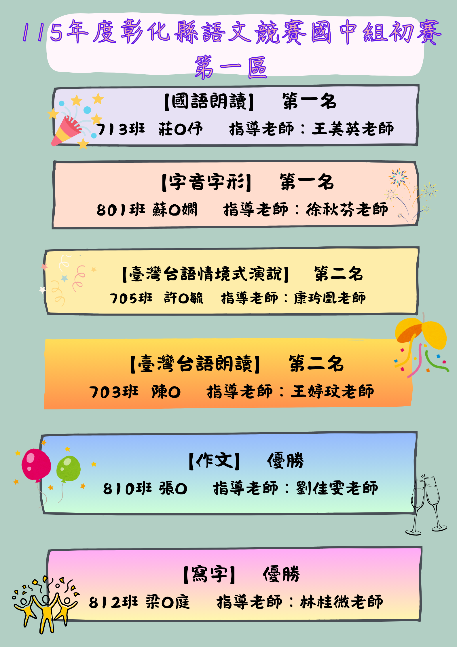 | 2026-04-23 | 一般 | 【轉知】「彰化縣立青少年管弦樂團115學年度團員甄選簡章」及「彰化縣立兒童弦樂團115學年度團員甄選簡章」請有興趣的學生踴躍報名參加! | 訓育組長 | 15 |
