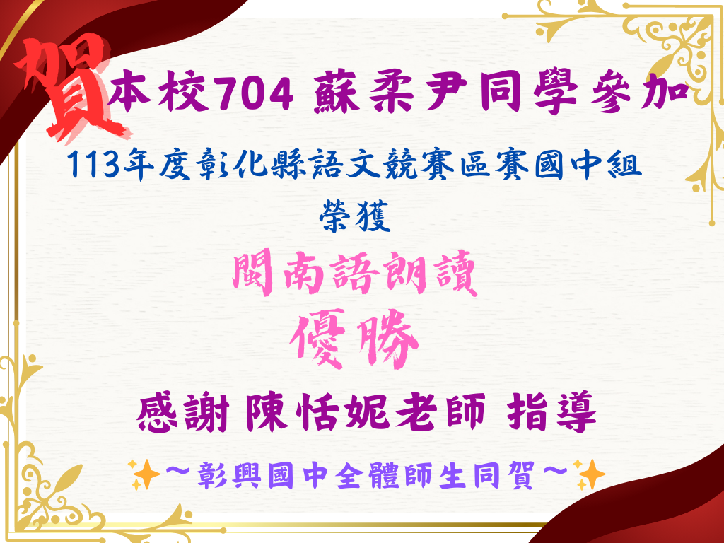 賀!704班蘇柔尹榮獲「113年度彰化縣語文競賽區賽-閩南語朗讀國中組」優勝!