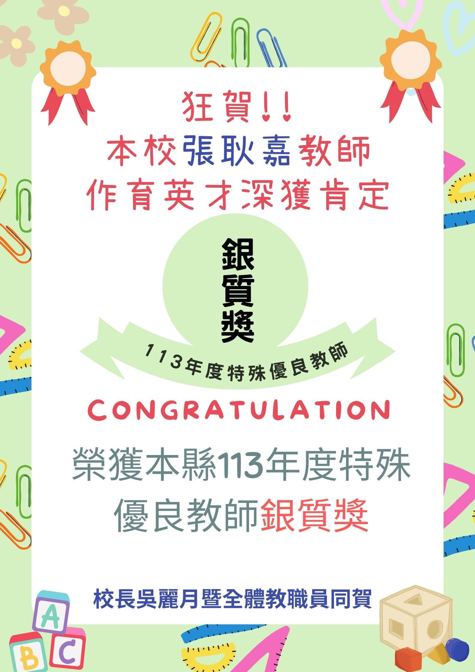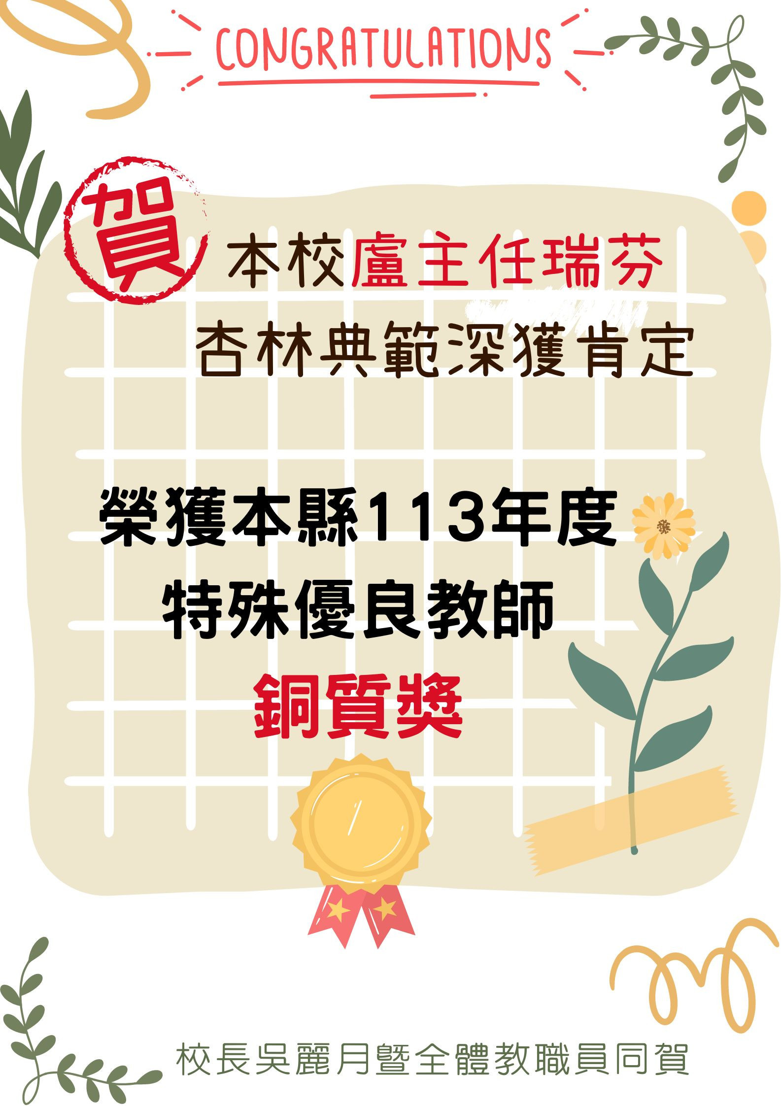 狂賀!! 本校盧主任瑞芬、張耿嘉教師 杏林典範作育英才深獲肯定, 榮獲本縣113年度特殊優良教師