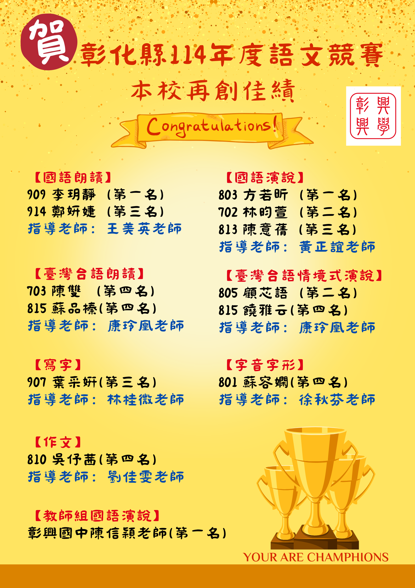 🎉恭賀本校選手參加全縣114年度語文競賽複賽國中組,成績表現優異😀