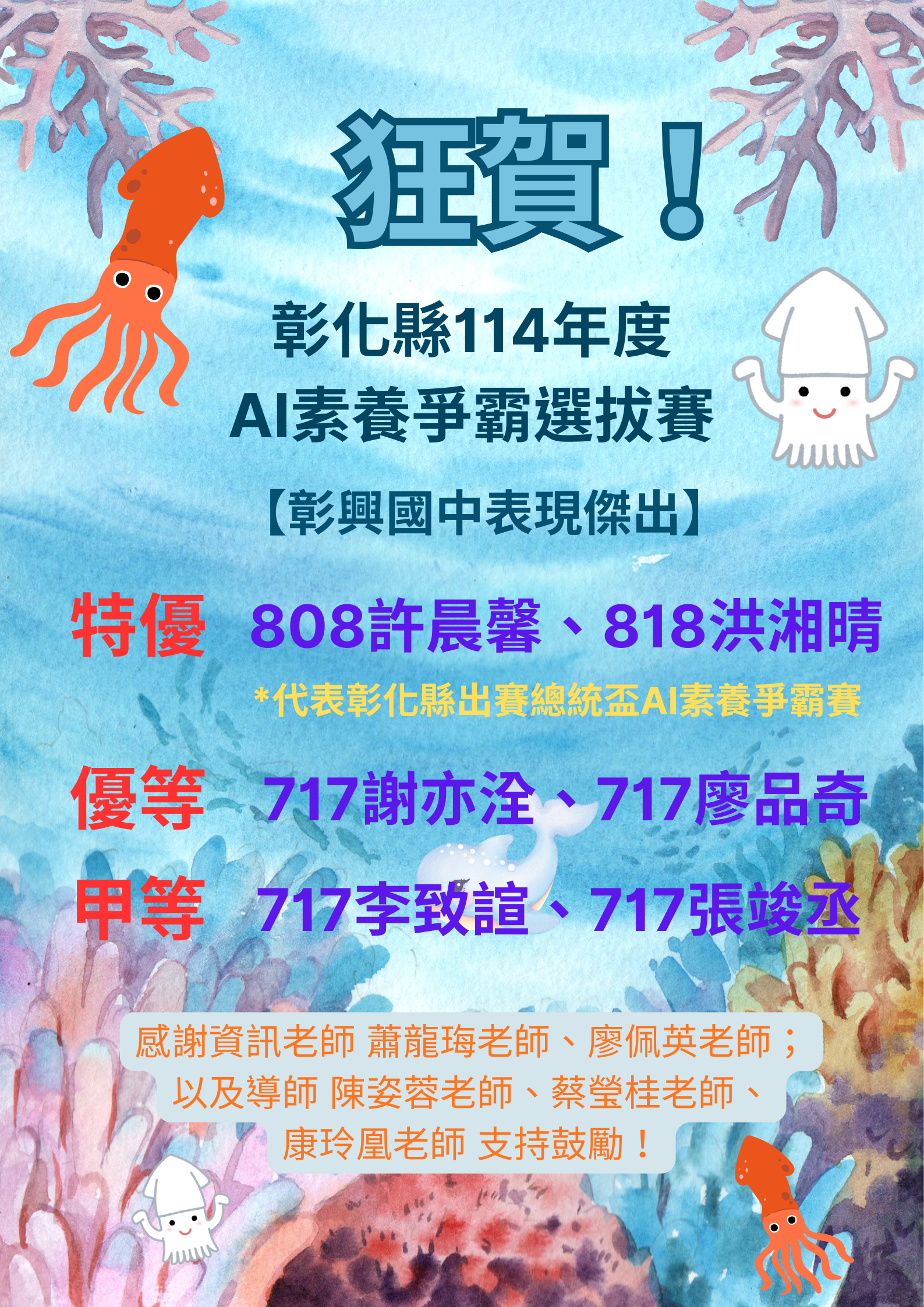 808許晨馨、818洪湘晴 榮獲特優,並晉級參加「114年度總統盃AI素養爭霸賽」 717謝亦洤、717廖品奇 榮獲優等 717李致諠、717張竣丞 榮獲甲等 感謝 資訊教師 蕭龍珻老師、廖佩英老師 指導! 導師 陳姿蓉老師、蔡瑩桂老師、康玲凰老師 支持鼓勵!