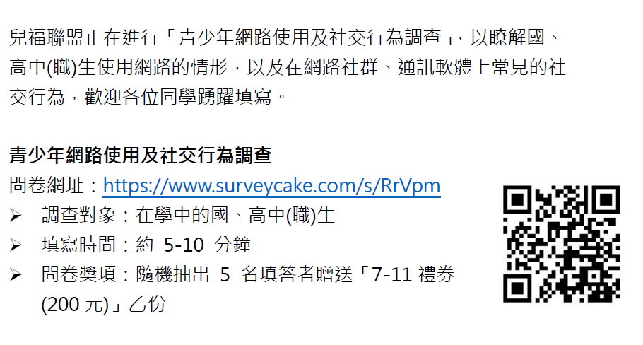 兒福聯盟進行「青少年網路使用及社交行為調查」,請各位同學踴躍填寫。
