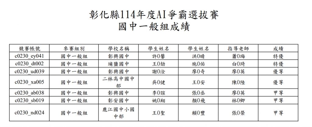 三、各組榮獲特優師生將代表本縣參加台南市政府主辦114 年度總統盃 AI 素養爭霸賽競賽,相關報名及集訓訊息將另行通知。