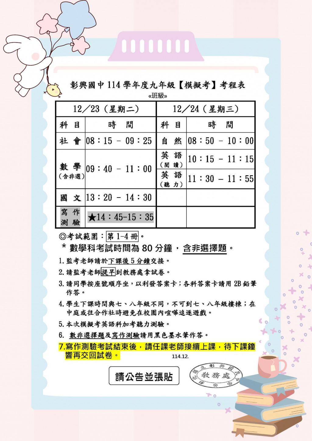 彰興國中114學年度上學期九年級第二次模擬考考程及注意事項公告