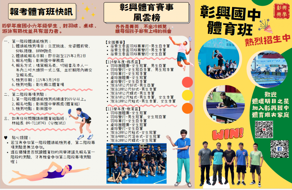 彰化縣115學年度國中體育班招生體適能檢測1. 檢測對象:115學年度國一入學新生,皆可參加(免費)。