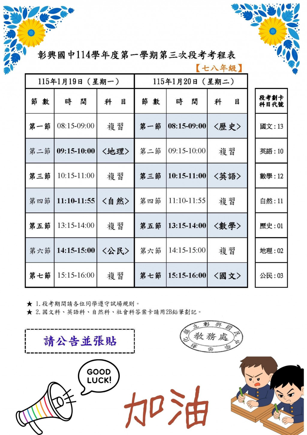 📢 彰興國民中學114學年度上學期【七八年級】第三次段考考程公告