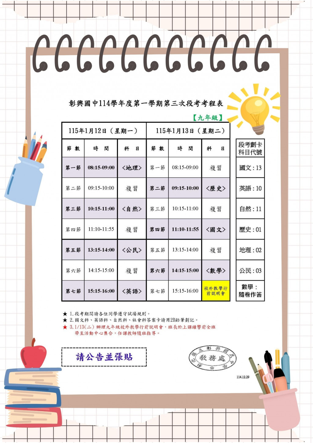 📢 彰興國民中學114學年度上學期九年級第三次段考考程公告