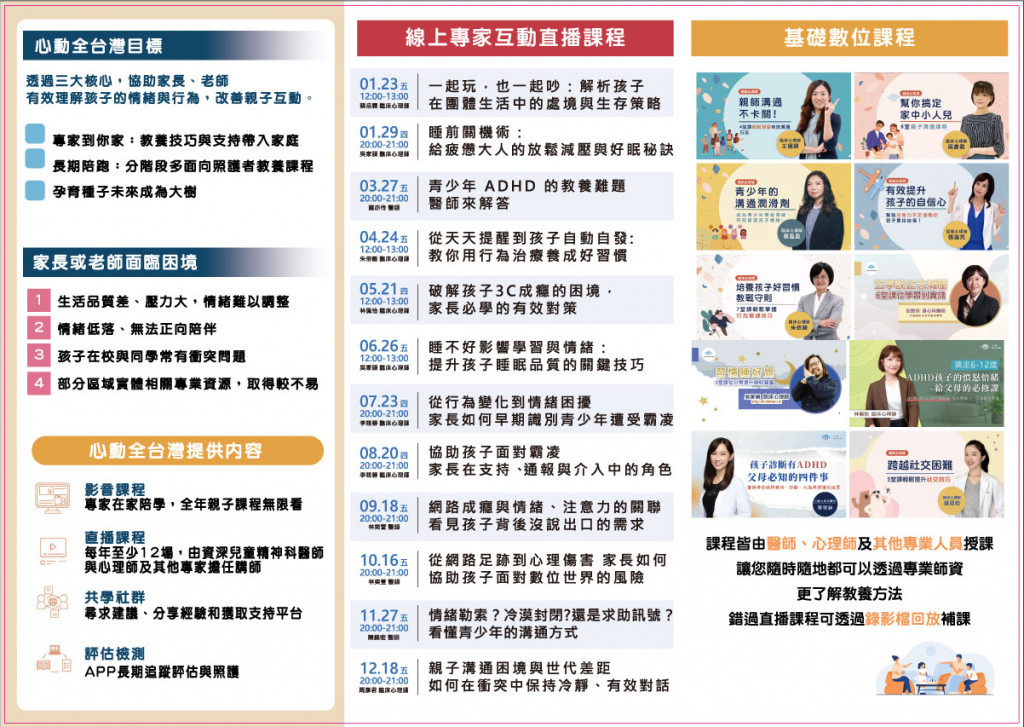 旨在提升離島及非六都地區之資源不足地區,協助照顧者透過專業親職賦能數位課程,提升照護注意力不足過動疾患(ADHD)等情緒行為發展弱勢兒童的能力,敬請貴單位協助公告並轉介符合需求之家長、照顧者、及教師等專業人員參與,讓有興趣參與之照顧者及專業人員更了解此方案之課程內容與進行方式