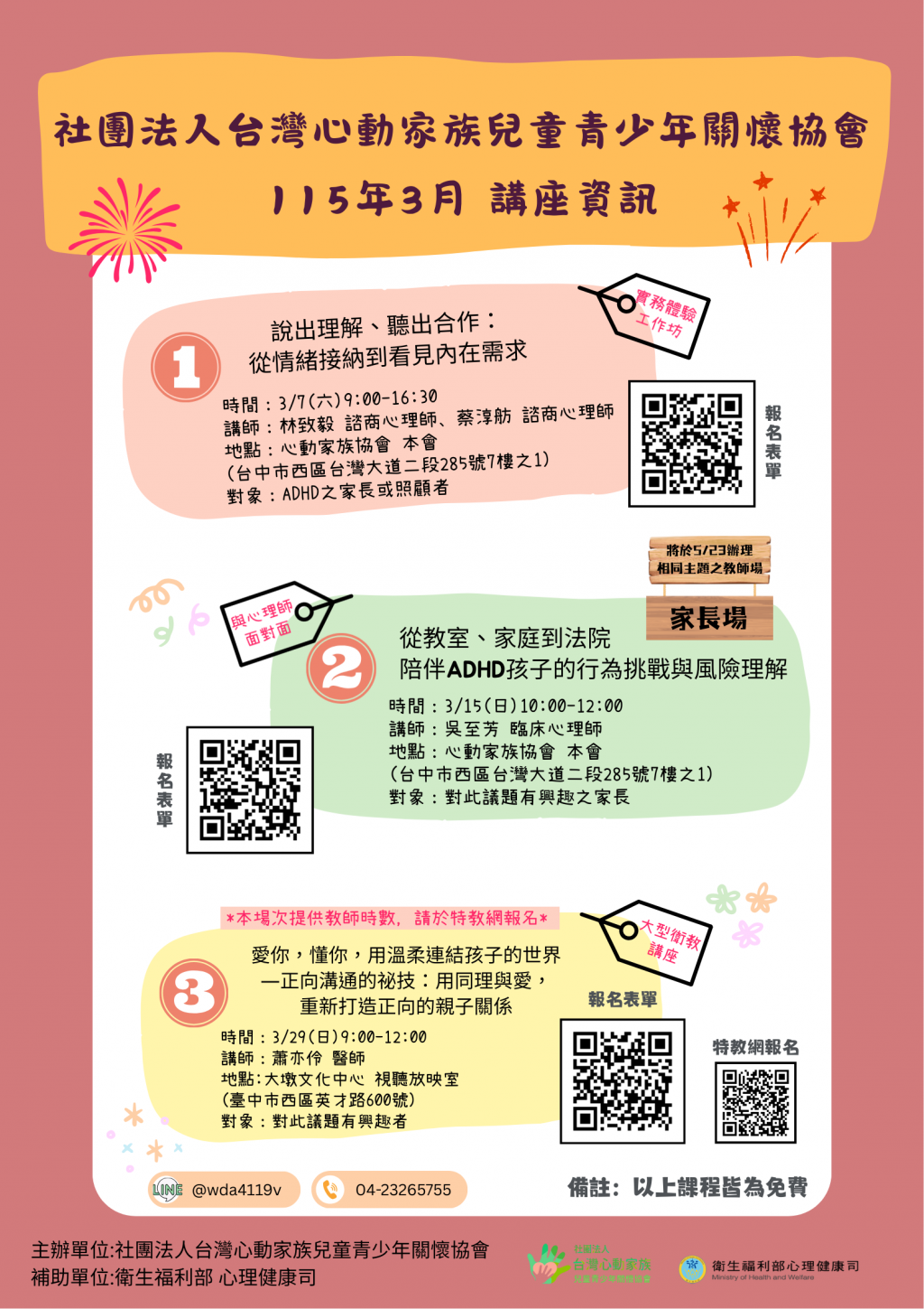 轉知心動家族協會辦理「115年03月 ADHD 相關主題講座及工作坊」海報