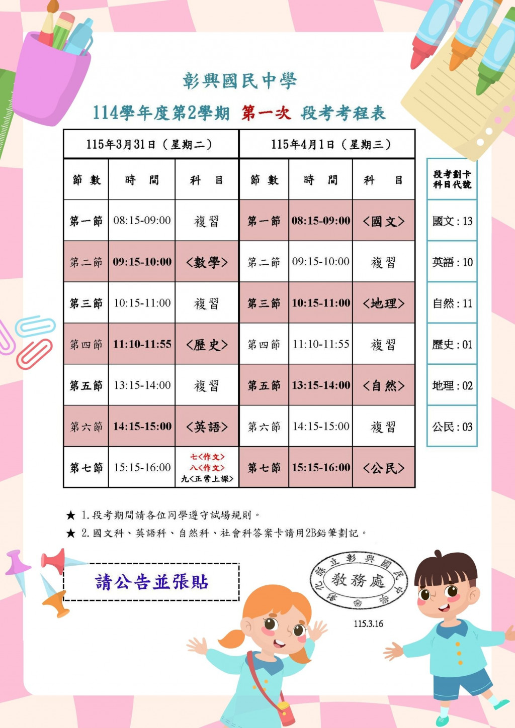 請同學們保持良好作息,調整心情,以最佳狀態迎接段考。祝福各位同學考試順利,成績亮眼!🌟