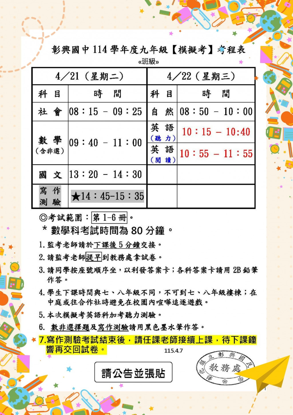 114學年度第二學期九年級第二次模擬考,考試資訊如下
